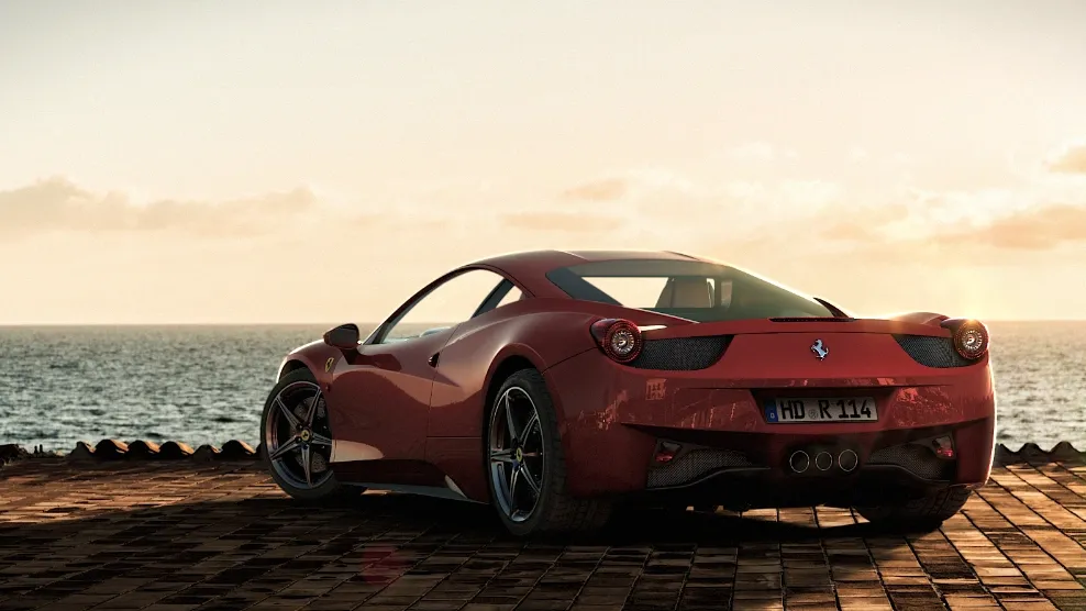 Fotorealistisches Automotive-Rendering: Ferrari F440 im HDR-Set „Coastal Roof 01“ –…